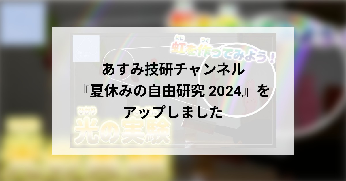2024年7月 1日 お知らせ あすみ技研チャンネル『夏休みの自由研究 2024』をアップしました 小学生や中学生の夏休みの宿題の定番、自由研究。 今年も動画を制作しました!今回のテーマは、『虹を作ってみよう!光の実験』です。 これから時代を担っていく子供たちに、『もっと身近に科学を』というテーマで動画制作しました。ぜひご覧ください。